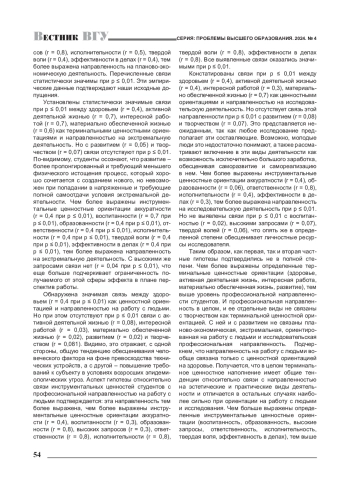 Имеется прямая связь между здоровьем (r = 0,4), активной деятельной жизнью (r = 0,7), интересной работой (r = 0,7), материально обеспеченной жизнью (r = 0,8), развитием (r = 0,5) как ценностными ориентациями и направленностью на практическую деятельность. Установленные связи статистически значимы при p ≤ 0,01. С творчеством связь опять же отсутствует (r = 0,04 при p ≤ 0,01), что уже указывает на тенденцию: выход за пределы того или иного алгоритма реализации практической деятельности не представляется студентам значимым.