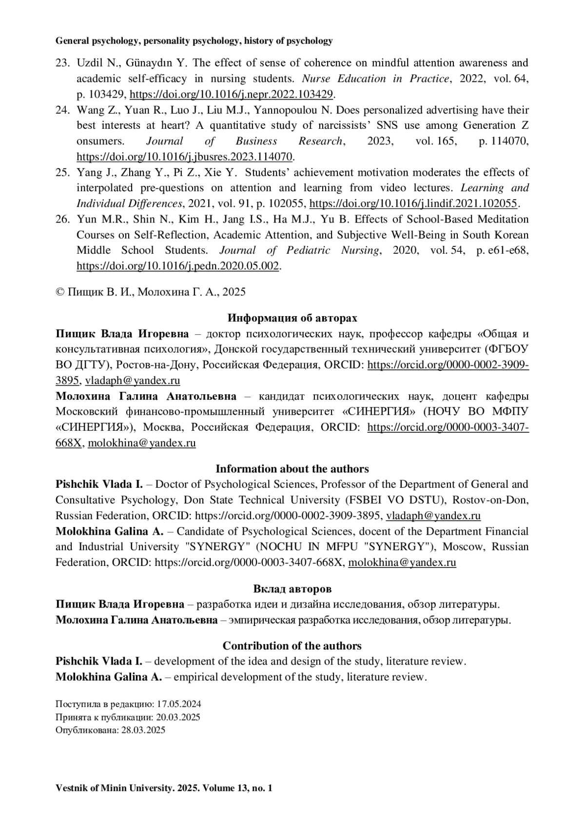 23. Uzdil N., Günaydın Y. The effect of sense of coherence on mindful attention awareness and academic self-efficacy in nursing students // Nurse Education in Practice. 2022. Vol. 64. P. 103429. https://doi.org/10.1016/j.nepr.2022.103429.