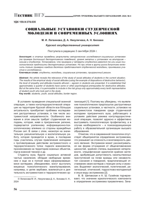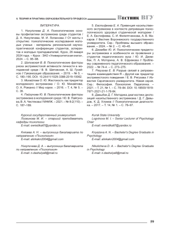 1. Никуличева Д. А. Психологические основы профилактики экстремизма среди студентов / Д. А. Никуличева, М. И. Логвинова // От мечты к открытию: психологические исследования молодых ученых: материалы региональной научнопрактической конференции студентов, аспирантов и молодых преподавателей, Курск, 26 января 2024 года. - Курск: ЗАО “Университетская книга”, 2024. - С. 95-98.