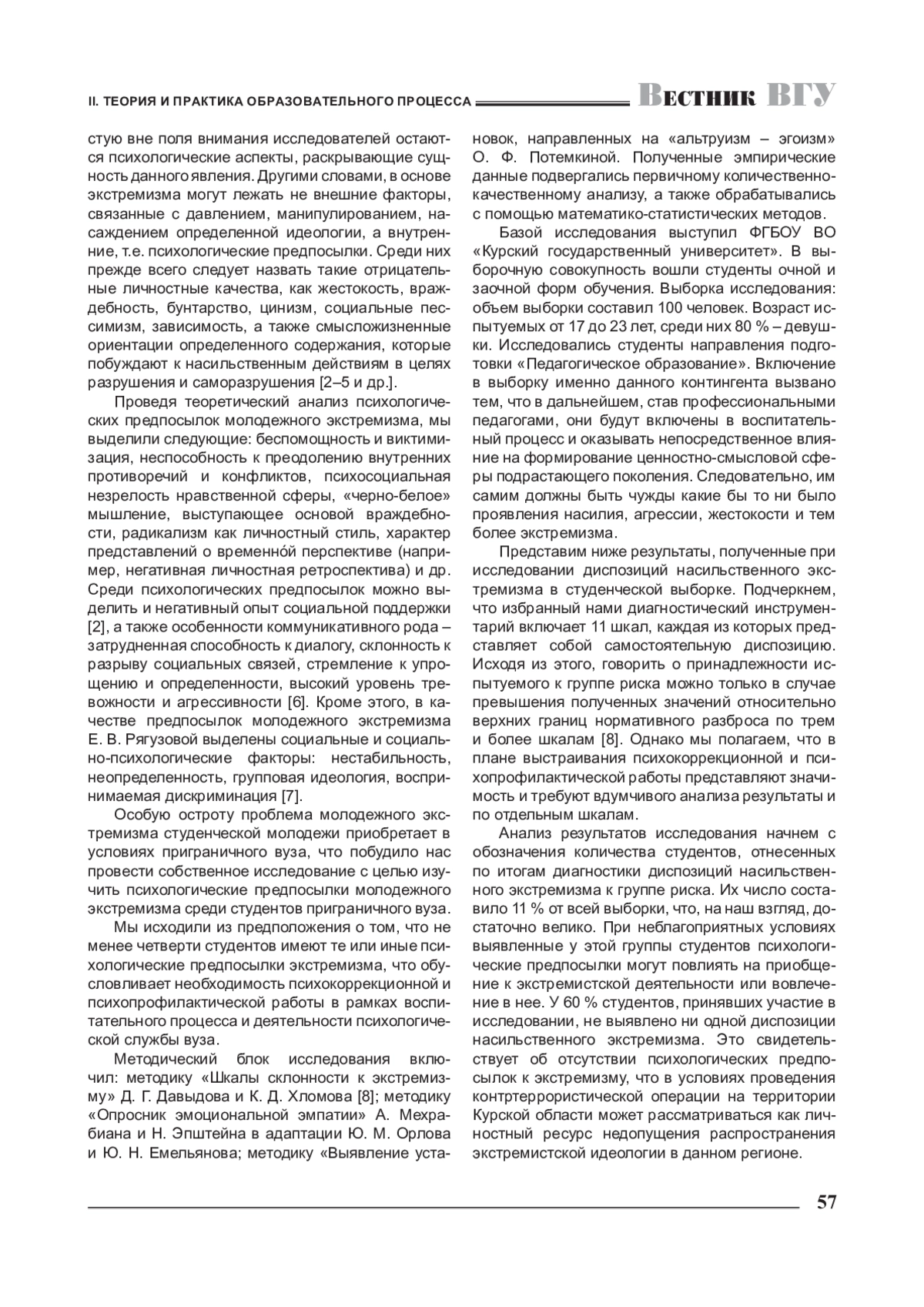 8. Давыдов Д. Г. Методика диагностики диспозиций насильственного экстремизма / Д. Г. Давыдов, К. Д. Хломов // Психологическая диагностика.-2017.-Т. 14, № 1. - С. 78-97. EDN: ZWRAQT