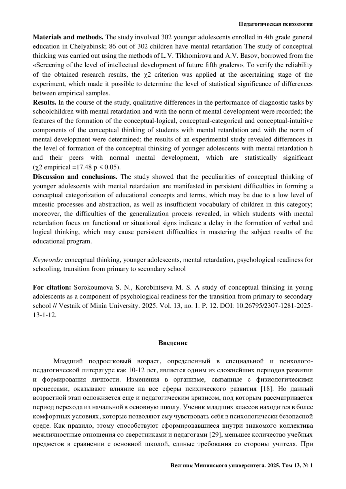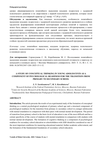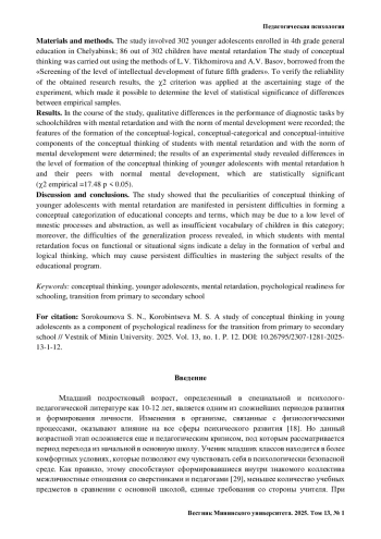 Введение. В статье представлены результаты экспериментального исследования сформированности понятийного мышления как центрального психологического новообразования младшего школьного возраста и структурного компонента психологической готовности к переходу из начальной в основную школу у младших подростков с задержкой психического развития в сравнении с их сверстниками с нормой психического развития. Период перехода из начальной школы на основную ступень образования является одним из сложнейших и имеет определенную специфику протекания у обучающихся с задержкой психического развития в сравнении со школьниками, имеющими норму психического развития. Сформированность познавательного мышления как компонента психологической готовности к обучению в основной школе у школьников с задержкой психического развития следует рассматривать как одно из важнейших условий освоения образовательного материала, дальнейшей академической успеваемости, формирования фундаментальных основ обучения в средней школе.