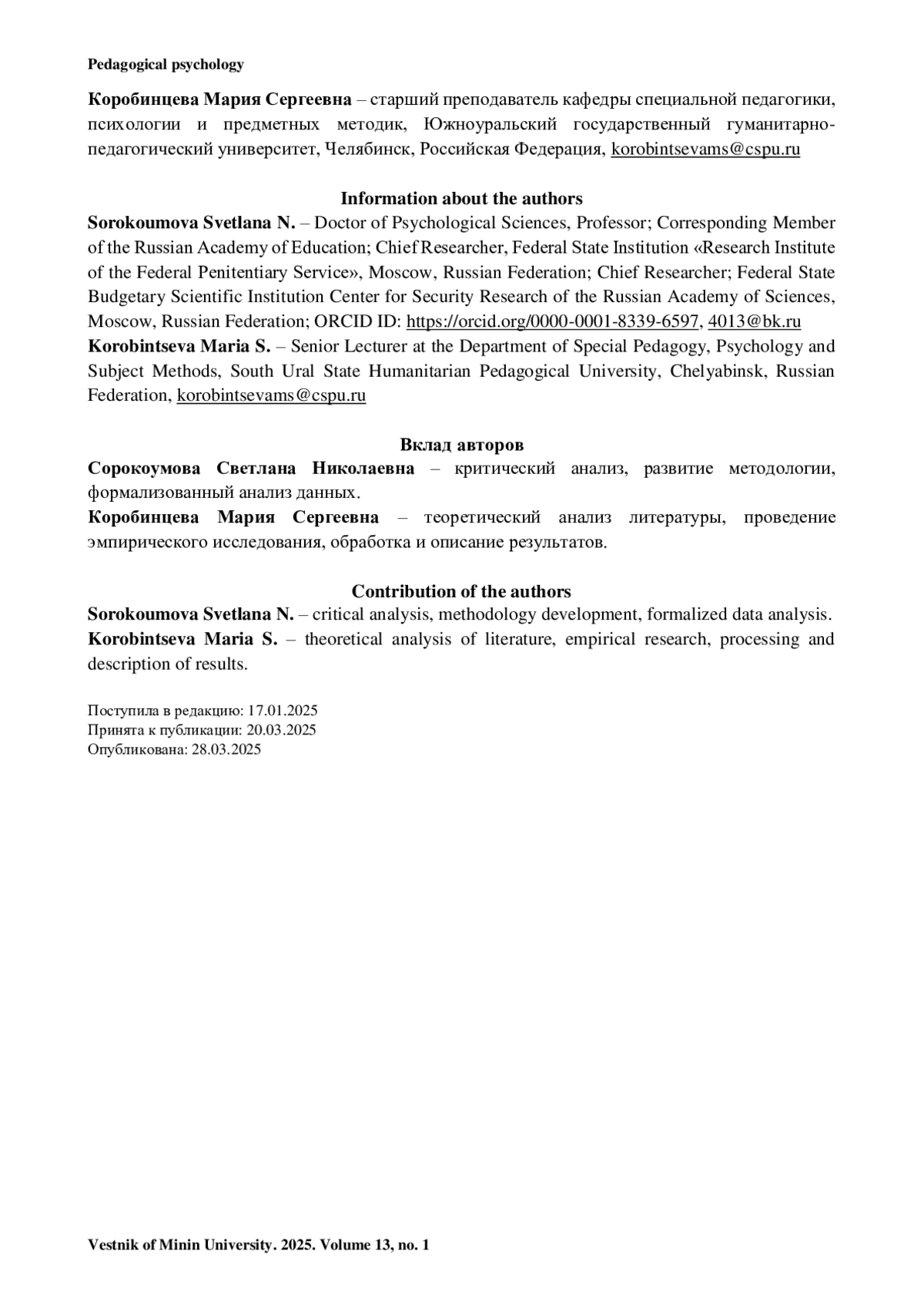 7. Дунаева Н. И., Сорокоумова С. Н. Психологическая структура сопротивляемости личности подростков, старшеклассников и студентов: основные эмпирические результаты // Вестник Санкт-Петербургского военного института войск национальной гвардии. 2024. № 1 (26). С. 109-117.