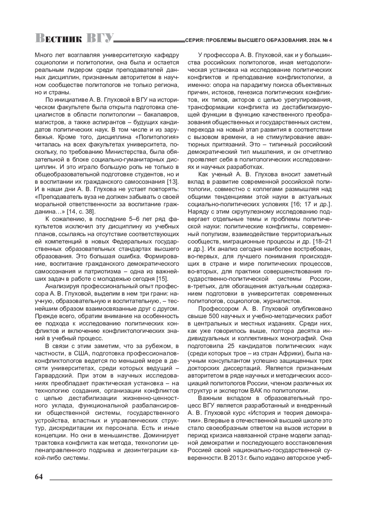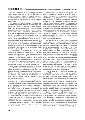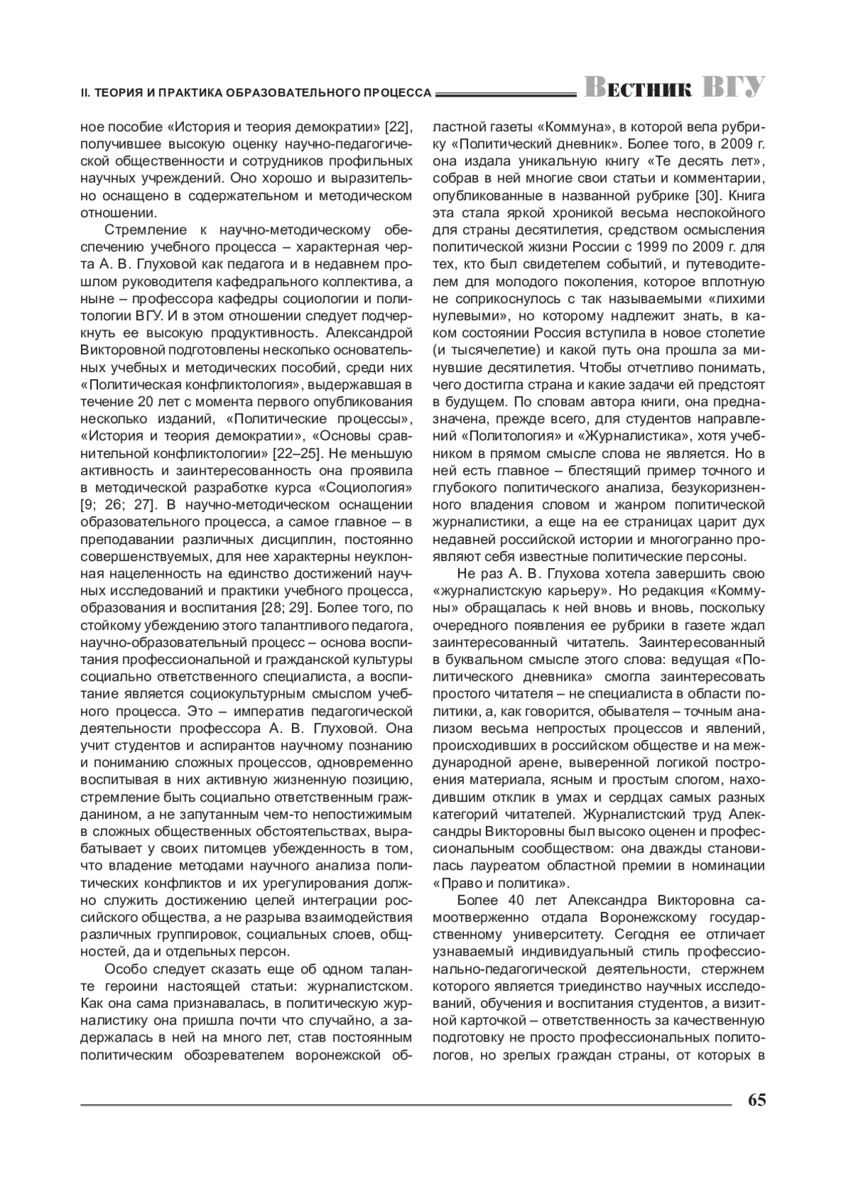 Как ученый А. В. Глухова вносит заметный вклад в развитие современной российской политологии, совместно с коллегами размышляя над общими тенденциями этой науки в актуальных социально-политических условиях [16; 17 и др.]. Наряду с этим скрупулезному исследованию подвергает отдельные темы и проблемы политической науки: политические конфликты, современный популизм, взаимодействие территориальных сообществ, миграционные процессы и др. [18–21 и др.]. Их анализ сегодня наиболее востребован, во-первых, для лучшего понимания происходящих в стране и мире политических процессов, во-вторых, для практики совершенствования государственно-политической системы России, в-третьих, для обогащения актуальным содержанием подготовки в университетах современных политологов, социологов, журналистов.