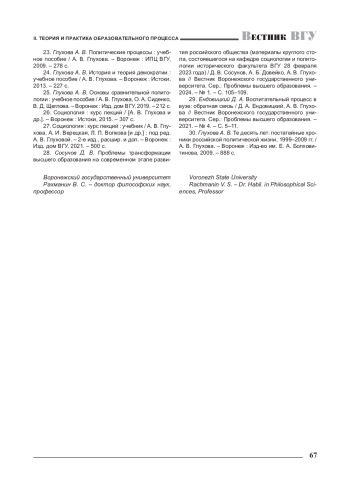 28. Сосунов Д. В. Проблемы трансформации высшего образования на современном этапе развития российского общества (материалы круглого стола, состоявшегося на кафедре социологии и политологии исторического факультета ВГУ 28 февраля 2023 года) / Д. В. Сосунов, А. Б. Довейко, А. В. Глухова // Вестник Воронежского государственного университета. Сер.: Проблемы высшего образования. -2024.-№ 1,-С. 105-109. EDN: BWTOJV