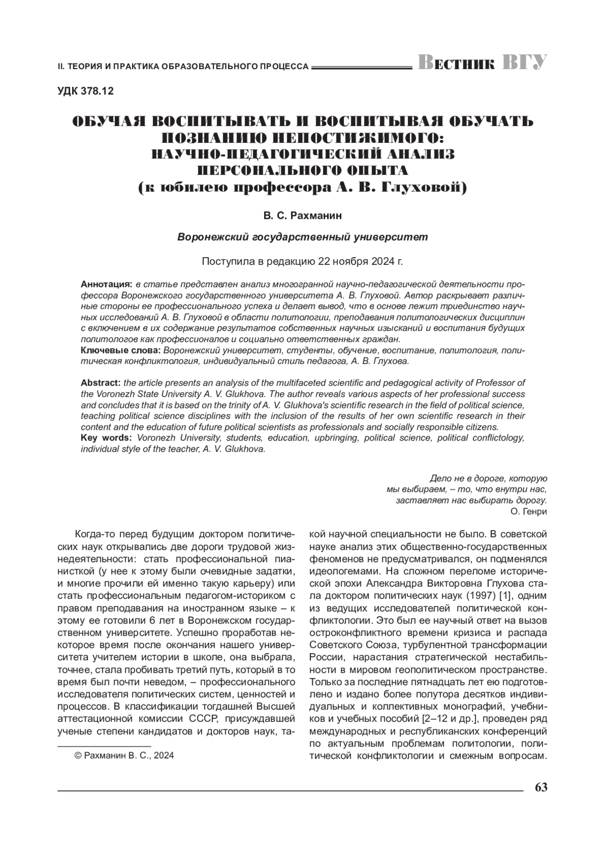 В статье представлен анализ многогранной научно-педагогической деятельности профессора Воронежского государственного университета А. В. Гпуховой. Автор раскрывает различные стороны ее профессионального успеха и делает вывод, что в основе лежит триединство научных исследований А. В. Глуховой в области политологии, преподавания политологических дисциплин с включением в их содержание результатов собственных научных изысканий и воспитания будущих политологов как профессионалов и социально ответственных граждан.