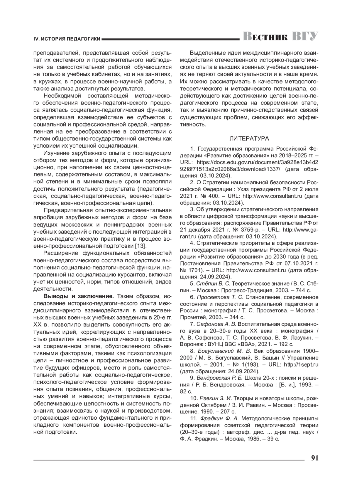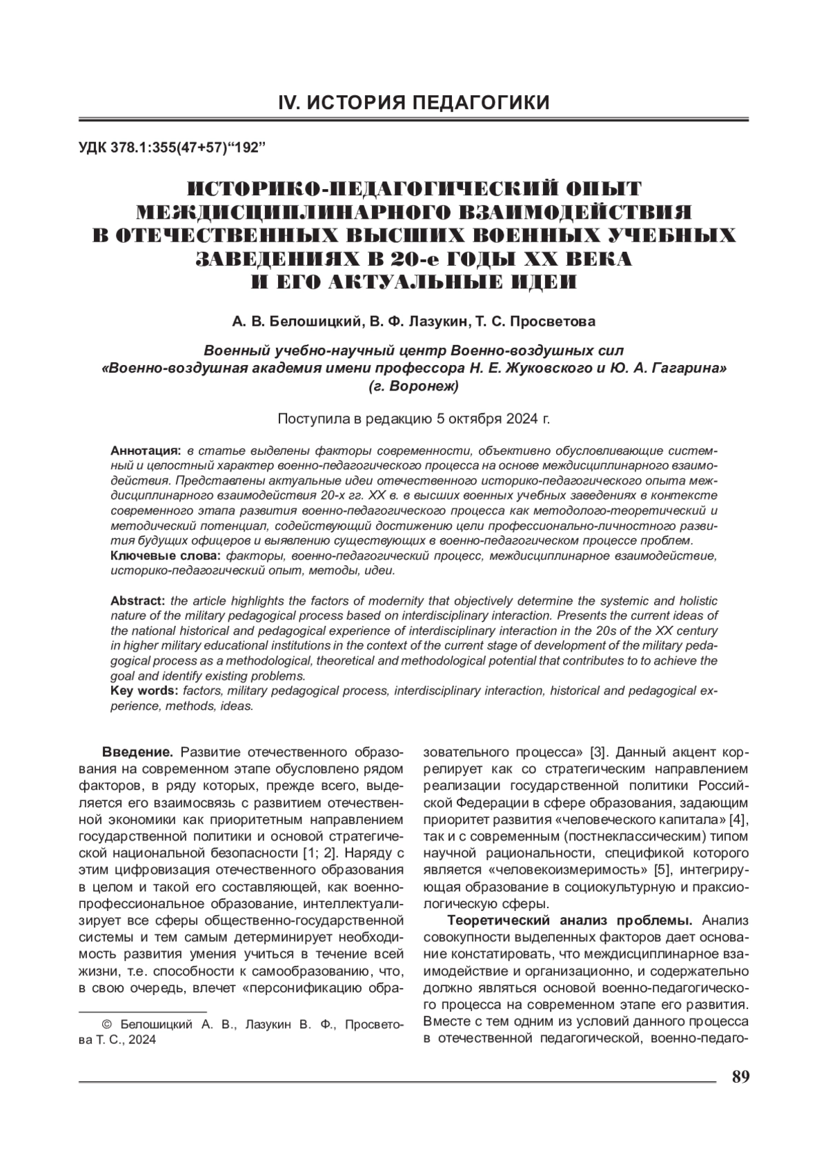 В статье выделены факторы современности, объективно обусловливающие системный и целостный характер военно-педагогического процесса на основе междисциплинарного взаимодействия. Представлены актуальные идеи отечественного историко-педагогического опыта междисциплинарного взаимодействия 20-х гг. XX в. в высших военных учебных заведениях в контексте современного этапа развития военно-педагогического процесса как методолого-теоретический и методический потенциал, содействующий достижению цели профессионально-личностного развития будущих офицеров и выявлению существующих в военно-педагогическом процессе проблем.