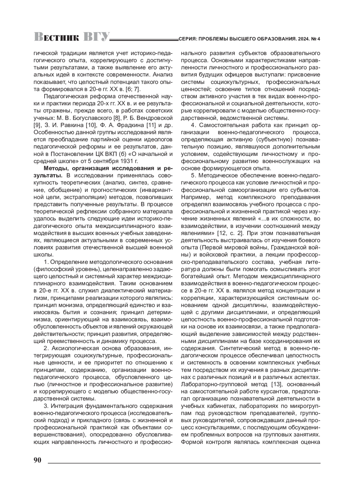 Методическое обеспечение военно-педагогического процесса как условие личностной и профессиональной самоорганизации его субъектов. Например, метод комплексного преподавания определял взаимосвязь учебного процесса с профессиональной и жизненной практикой через изучение жизненных явлений «… в их сложности, во взаимодействии, в изучении соотношений между явлениями» [12, с. 2]. При этом познавательная деятельность выстраивалась от изучения боевого опыта (Первой мировой войны, Гражданской войны) и войсковой практики, а лекции профессорско-преподавательского состава, учебная литература должны были помогать осмысливать этот богатейший опыт. Методом междисциплинарного взаимодействия в военно-педагогическом процессе в 20-е гг. XX в. являлся метод концентрации и корреляции, характеризующийся системным основанием одной дисциплины, взаимодействующей с другими дисциплинами, и определяющий целостность военно-профессиональной подготовки на основе их взаимосвязи, а также предполагающий выделение зависимостей между родственными дисциплинами на базе координирования их содержания.