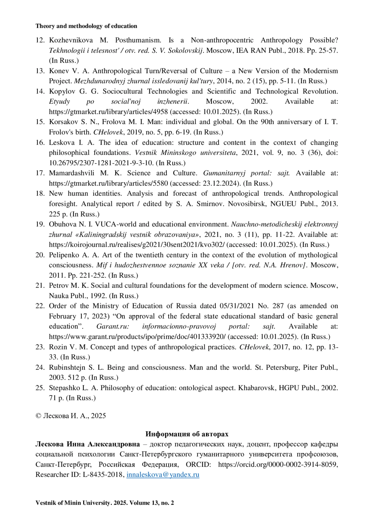 16. Лескова И. А. Идея образования: структура и содержание в контексте смены философских оснований // Вестник Мининского университета. 2021. Т. 9, № 3 (36). https://doi.org/10.26795/2307-1281-2021-9-3-10.
