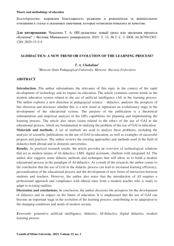 Введение. Автор обосновывает актуальность данной темы в контексте быстрого развития технологий и их влияния на образование. Статья рассматривает актуальные тенденции в современной системе образования, связанные с применением искусственного интеллекта (ИИ) в процессе обучения. Автор исследует новое направление в педагогической науке – ИИ-дидактику, анализирует перспективы данного направления и рассуждает, является ли это новым трендом или же представляет собой эволюционный этап в развитии образовательной системы. Целью публикации является теоретическое обоснование и эмпирический анализ возможностей генеративного искусственного интеллекта (далее – ГИИ) для планирования и реализации процесса обучения. В статье также поднимаются вопросы, которые связаны с этикой применения ГИИ в учебном процессе и являются основополагающими в изучении проблемы применения ГИИ в образовании.