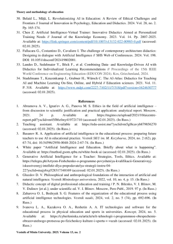 3. Басанов Р. А. Применение искусственного интеллекта в образовательном процессе: подготовка будущих педагогов к использованию AI в учебной практике // Вестник СКУ им. М. Козыбаева. 2024. № 2 (62). С. 67-74. https://doi.org/10.54596/2958-0048-2024-2-67-74.