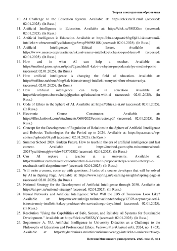 5. Генеративный искусственный интеллект для преподавателя: стратегии, инструменты, этика. URL: https://telegra.ph/Artyom-Feshchenko-o-programme-povysheniya-kvalifikacii-Generativnyj-iskusstvennyj-intellekt-dlya-prepodavatelya-strategii-instru-04-22?ysclid=majy6xp528317348169 (дата обращения: 02.01.2025).