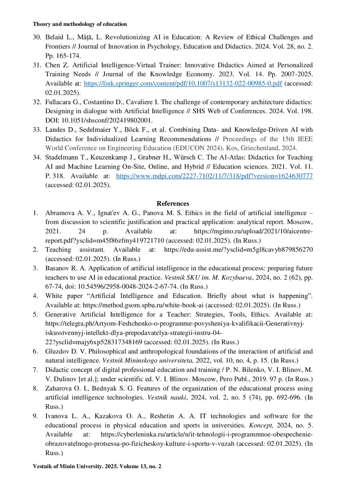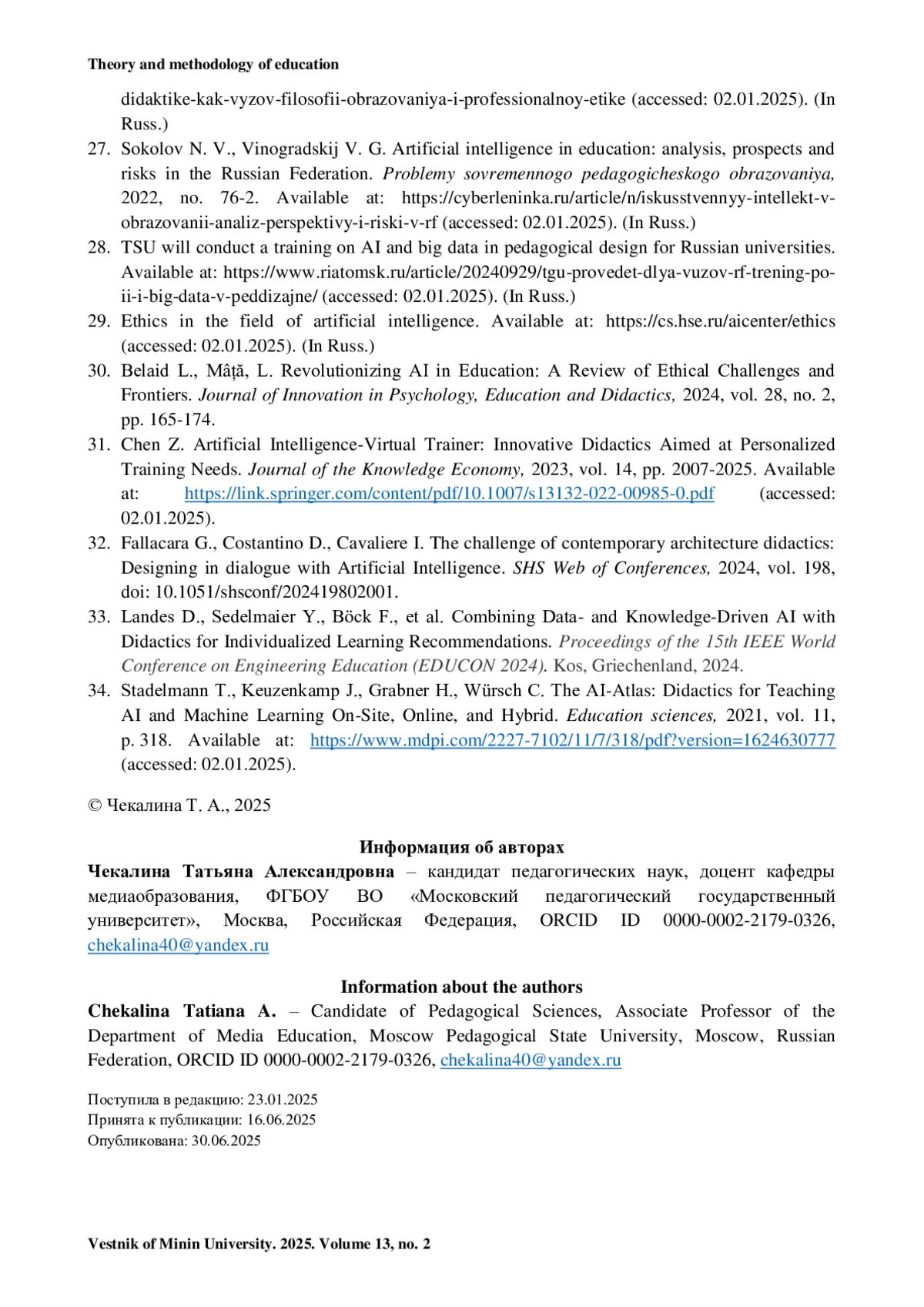 27. Соколов Н. В., Виноградский В. Г. Искусственный интеллект в образовании: анализ, перспективы и риски в РФ // Проблемы современного педагогического образования. 2022. № 76-2. URL: https://cyberleninka.ru/article/n/iskusstvennyy-intellekt-v-obrazovanii-analiz-perspektivy-i-riski-v-rf (дата обращения: 02.01.2025).