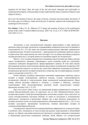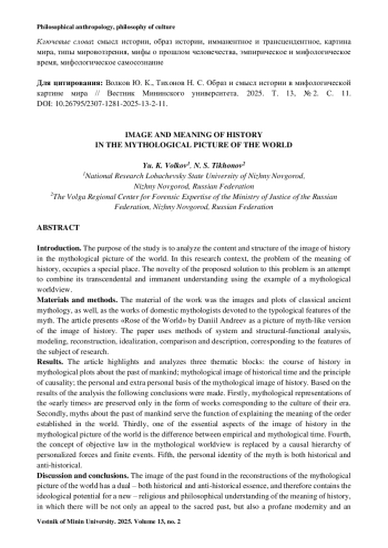 Введение. Целью проведённого исследования является анализ содержания и структуры образа истории в мифологической картине мира. В этом исследовательском контексте особое место занимает проблема смысла истории. Новизна предлагаемого варианта решения указанной проблемы состоит в попытке соединить её трансцендентное и имманентное понимание на примере мифологического мировоззрения.