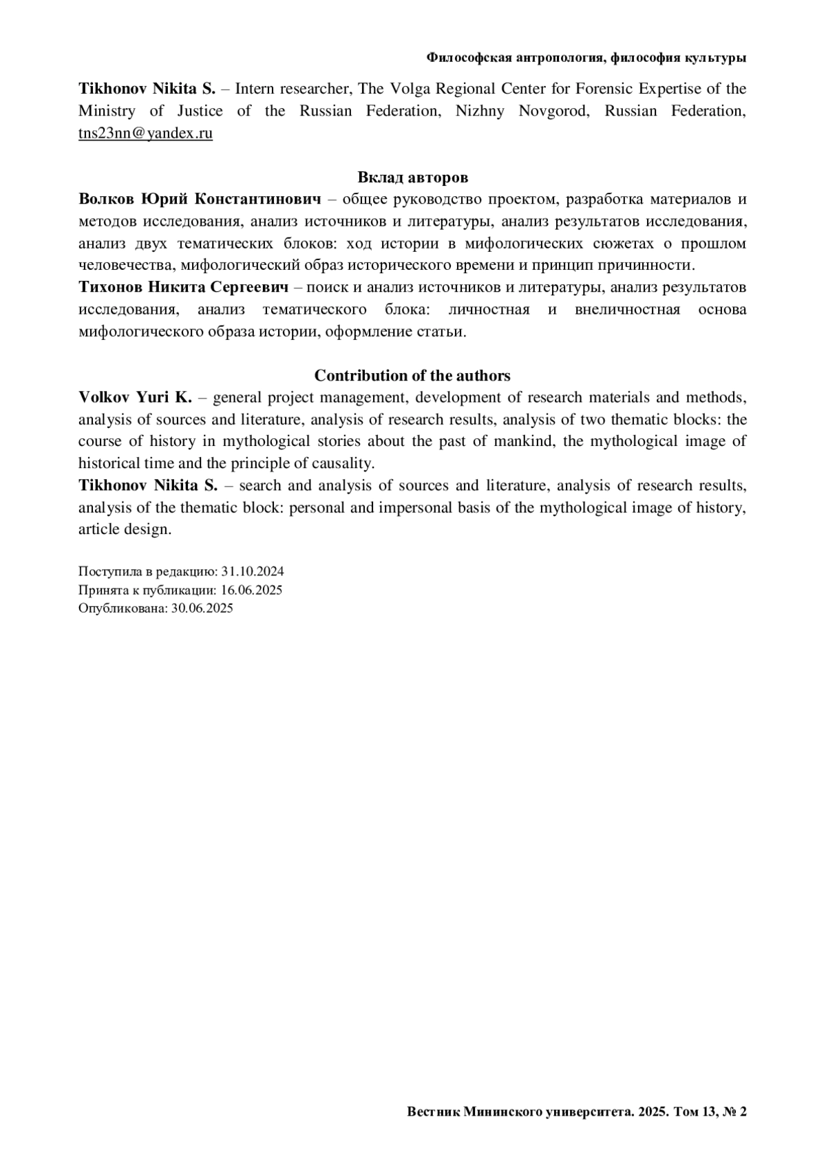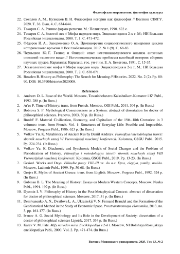 Обсуждение и заключения. Образ прошлого, обнаруженный в реконструкциях мифологической картины мира, обладает двойственной ‒ одновременно исторической и антиисторической – сущностью, а потому содержит в себе идейный потенциал для нового ‒ религиозного и философского понимания смысла истории. Таким образом, единство реального и ирреального, имманентного и трансцендентного в мифологических описаниях прошлого, помогает лучше понять истоки мировоззренческого дуализма объективной и субъективной истории.