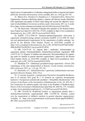 Охарактеризована система управленческой практики организации и обеспечения обучающихся общеобразовательных учреждений Республики Башкортостан школьным питанием. Актуальность заявленной темы обоснована с акцентом на социально-гуманистическую роль школьного питания для развития человеческого капитала. В связи с этим предлагается выделить социальные практики питания, куда относится и школьное, в особый вид экономической деятельности, в основе которого, с одной стороны, лежит невысокий коммерческий интерес основных игроков, а с другой - серьезные возможности для развития региональных экономик при поддержке государства. Выявлено, что основу системы управления школьным питанием составляют три важных процесса: планирование, реализация и контроль. Заключительным этапом управленческого процесса является корректировка. На этапе планирования, в соответствии с требованиями законодательства, органы исполнительной власти в лице министерств и ведомств осуществляют разработку и утверждение вариантов республиканских школьных меню, в том числе специализированных. К реализации плана приступают непосредственно образовательные организации. Этот этап условно делится на производство, за которое отвечают общеобразовательные организации и комбинаты питания, и потребление, участниками которого являются школьники и их родители. Реализация школьного питания тесно связана с системой контроля данного процесса. В Республике Башкортостан оценка организации и качества питания представлена в форме государственного и общественного контроля. Государственный контроль заключается в проверке санитарных условий и соответствия качества пищи установленным нормам. Общественный осуществляют Общественный совет при Министерстве образования и науки РБ, куда входят представители педагогического сообщества, специалисты в области развития образования, а также бракеражные комиссии, состоящие из родителей школьников. Анализ системы школьного питания на этапах планирования, реализации и контроля позволяет выявить необходимость корректировки на всех этих этапах для совершенствования механизма управления данным процессом.