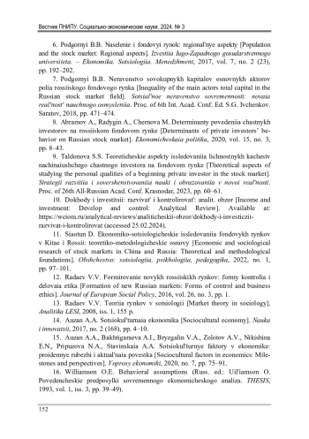 9. Талдонова, С.С. Теоретические аспекты исследования личностных качеств начинающего частного инвестора на фондовом рынке / С.С. Талдонова // Стратегии развития и совершенствования науки и образования в новой реальности: Материалы XXVI Всерос. науч.-практ. конф. - Краснодар, 2023. - С. 60-61. EDN: LAVWDJ