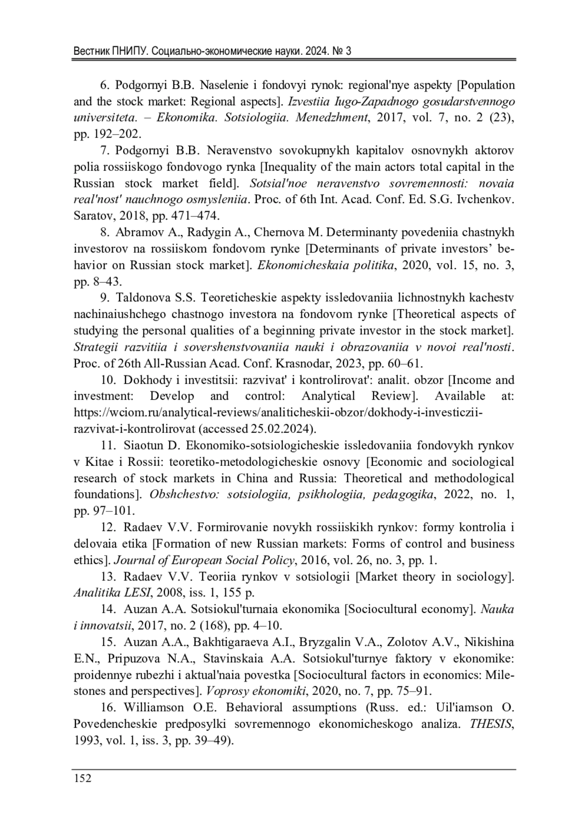 8. Абрамов, А. Детерминанты поведения частных инвесторов на российском фондовом рынке / А. Абрамов, А. Радыгин, М. Чернова // Экономическая политика, 2020. - Т. 15, № 3. - С. 8-43. EDN: GIQDGC