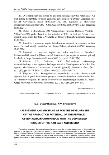 24. Забелина, И.А. Механизмы ускоренного экономического роста регионов Дальнего Востока / И.А. Забелина, К.В. Парфенова // Социум и власть. - 2021. - № 1 (87). - C. 60-75. DOI: 10.22394/1996-0522-2021-1-60-75 EDN: XQJNXD