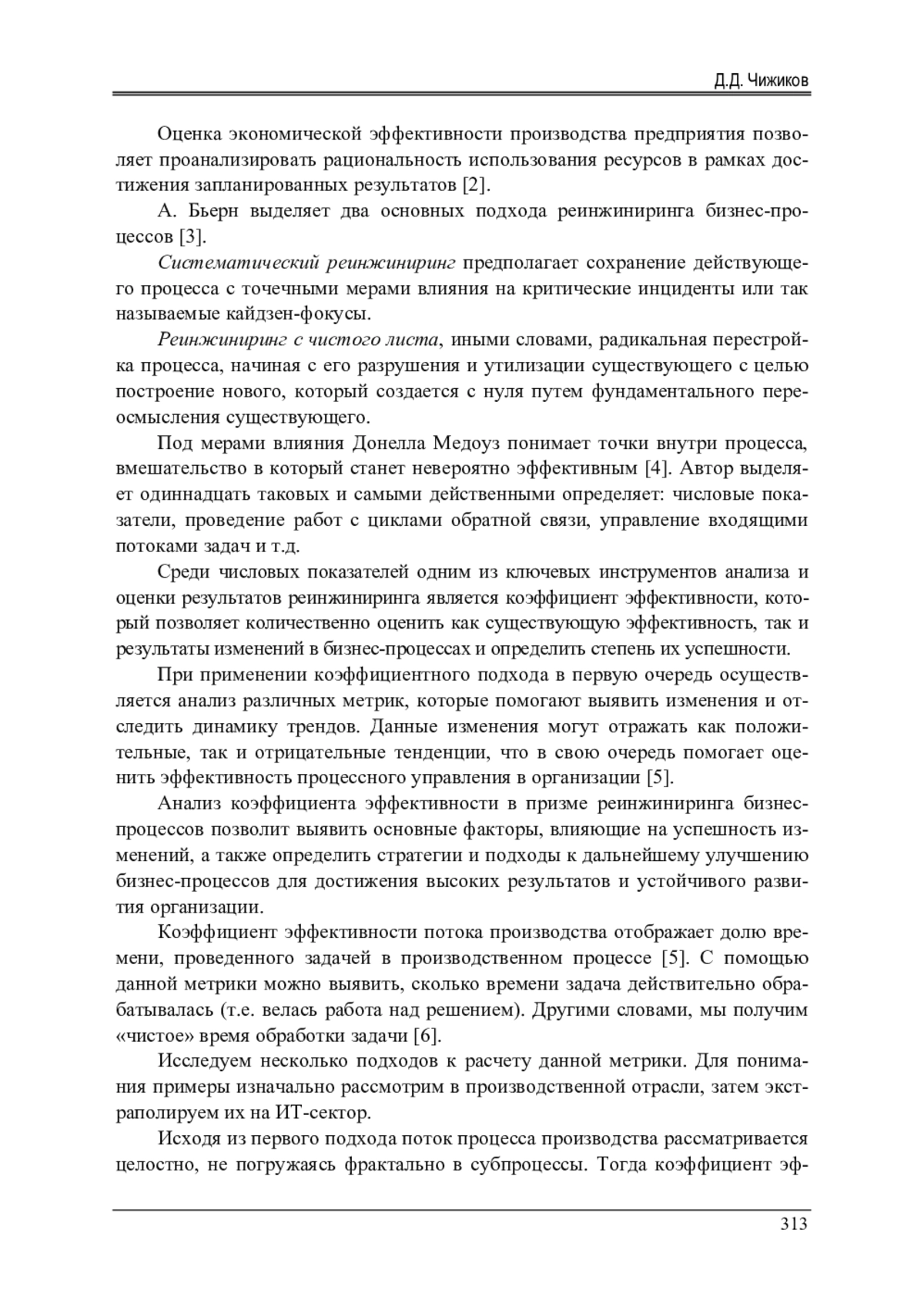 Представлено исследование применения коэффициентного подхода в оценке эффективности производственных процессов с особым акцентом на реинжиниринг бизнес-процессов. Описываются ключевые метрики оценки производственных процессов организации, включая коэффициент эффективности потока производства. Рассматривается фундаментальная разница между результативностью и эффективностью, а также между эффективностью и экономической эффективностью, что помогает понять суть рассматриваемых понятий. Проведен анализ различных подходов к реинжинирингу бизнес-процессов, выделяя два основных метода: систематический и радикальный. В контексте этого исследования особое внимание уделяется коэффициенту эффективности потока, который рассматривается как ключевой инструмент оценки производственной деятельности. Представлены различные подходы к расчету коэффициента эффективности потока производства, с акцентом на их применение в производственной и ИТ-отраслях. Обсуждаются преимущества и ограничения каждого из подходов, а также практическая значимость получаемых результатов для проведения оценочных работ касательно эффективности производственных процессов.