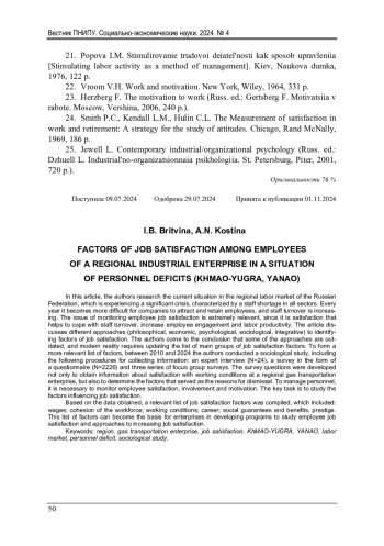 Проведено исследование текущей ситуации на региональном рынке труда Российской Федерации, который переживает существенный кризис, характеризующийся дефицитом кадров во всех отраслях. Компаниям с каждым годом становится сложнее привлекать и удерживать сотрудников, а текучесть кадров растет. Крайне актуальным является вопрос изучения удовлетворенности трудом сотрудников, так как именно удовлетворенность помогает бороться с текучестью кадров, повышать вовлеченность сотрудников и производительность труда. Рассмотрены разные подходы (философский, экономический, психологический, социологический, интегративный) к выделению факторов удовлетворенности трудом. Авторы приходят к выводу, что некоторые из подходов устарели, современная действительность требует актуализации перечня основных групп факторов удовлетворенности трудом. Для формирования более актуального списка факторов авторами с 2010 по 2024 г. было проведено социологическое исследование, включающее следующие процедуры сбора информации: экспертное интервью ( N =24), опрос в форме анкетирования ( N =2226) и три серии фокус-группового опроса. Вопросы для анкетирования были разработаны не только для получения информации об удовлетворенности условиями труда на региональном газотранспортном предприятии, но и для определения факторов, послуживших причинами увольнения. Чтобы управлять персоналом, необходимо следить за удовлетворенностью трудом сотрудников, их вовлеченностью и мотивированностью. Ключевой задачей становится исследование факторов, влияющих на удовлетворенность трудом. На базе полученных данных был составлен актуальный список факторов удовлетворенности трудом, в который вошли: оплата труда; сплоченность трудового коллектива; условия труда; служебная карьера; социальные гарантии и блага, престижность. Данный перечень факторов может стать основой для предприятий в разработке программ исследования удовлетворенности трудом сотрудников, подходов к повышению удовлетворенности трудом.