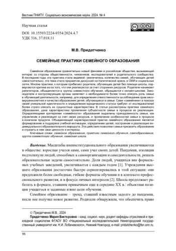 Семейное образование сравнительно новый феномен в российском обществе, вызывающий интерес со стороны общественности, чиновников, исследователей и родительского сообщества. В последние годы эта практика стала видимой: увеличилось количество семей, обучающих детей самостоятельно, эта тема стала предметом дискуссий на политической арене, в СМИ и социальных сетях. Многие практики, к которым прибегают родители, обучающие детей без помощи школы, подвергаются критике из-за того, что они реализуются за счет сторонних ресурсов. Родители нанимают репетиторов, объединяются в группы совместного обучения, обращаются к онлайн-школам. Законодатели и контролирующие органы заявляют о необходимости более точно описать роль семьи в обучающей деятельности, например, для определения ответственности за соблюдение прав несовершеннолетних и качество образования детей, обучающихся в семье. Сами «семейники» в поисках своей уникальной идентичности и определении юридического статуса требуют от исследователей более строго описать их сущностные характеристики. В статье рассмотрены практики семейного образования, дана характеристика проявления субъектности семьи в процессе их реализации. Определяющими критериями «семейности» образования выделены принадлежность семье, как управление и реализация за счет своих ресурсов, и проявление особенностей семьи в процессе и конечном продукте. Объединяющей характеристикой практик семейного образования является формирование и поддержка учебной мотивации, определение целей, построение и реализация индивидуального образовательного маршрута. Эти действия позволяют семье присвоить образование и отразить в нем свои ценности и интересы.