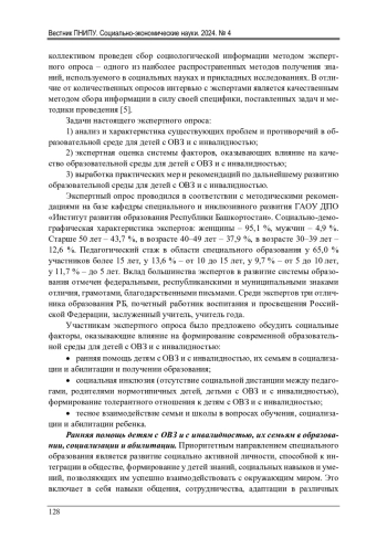 Рассматриваются социальные факторы, оказывающие влияние на формирование образовательной среды для детей с ограниченными возможностями здоровья и с инвалидностью в общеобразовательных учреждениях Республики Башкортостан. Задача исследования - дать оценку современного состояния специального образования через характеристику ее факторов. Актуальность исследования обусловлена постоянным ростом числа детей с ограниченными возможностями здоровья и с инвалидностью за счет расширения категорий нозологии и совершенствования системы диагностирования. В 2023 г. Республика Башкортостан оказалась в числе лидеров по количеству детей-инвалидов среди регионов Приволжского федерального округа. Выводы базируются на результатах социологического исследования, проведенного методом экспертного опроса. В ходе социологического исследования были выявлены социальные факторы и противоречия, наличие или отсутствие которых непосредственным образом оказывает влияние на формирование образовательной среды. Наиболее значимые из них - оказание ранней помощи детям с ограниченными возможностями здоровья, детям-инвалидам, их семьям в социализации/абилитации и получении образования, организация социальной инклюзии и формирование толерантного отношения к детям, взаимодействие семьи и школы в вопросах обучения, воспитания и коррекции детей с ограниченными возможностями здоровья и с инвалидностью, совершенствование системы государственного и общественного контроля качества образовательного процесса. Новизна исследования заключается в том, что оценка социальных факторов специального образования проведена экспертами - педагогами и специалистами интегрированного и инклюзивного образования. В ходе исследования экспертами дана оценка противоречий, существующих в организации педагогического процесса.