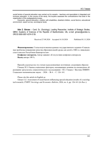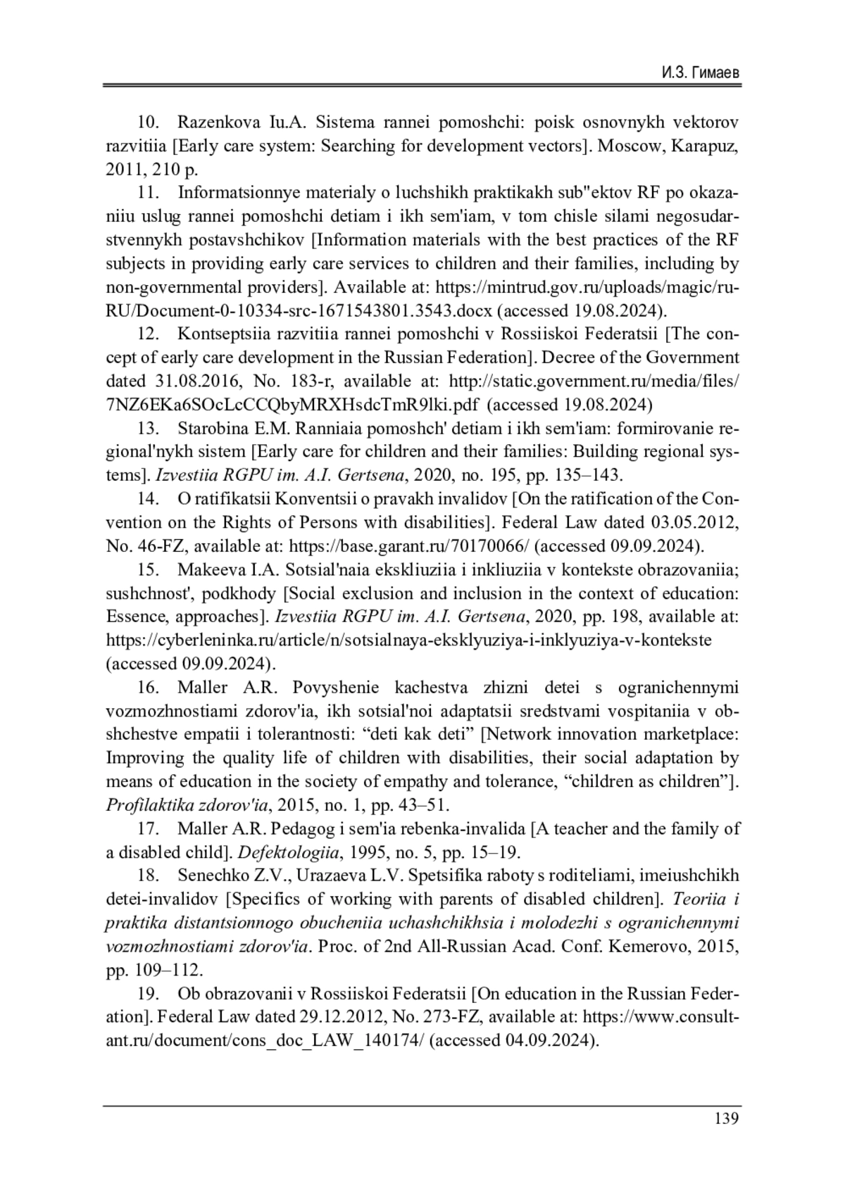 1. Гимаев, И.З. Система образования детей с ограниченными возможностями здоровья как объект научного исследования / И.З. Гимаев // Society and Security Insights. - 2024. - Т. 7, № 2. - С. 156-168. EDN: CHMGUD