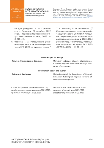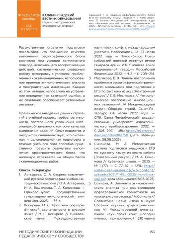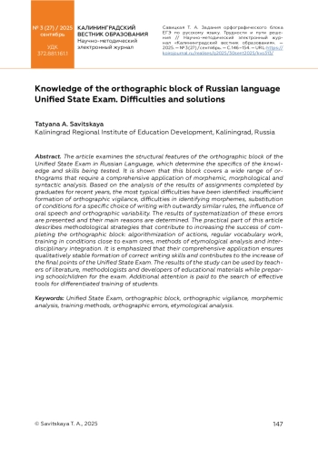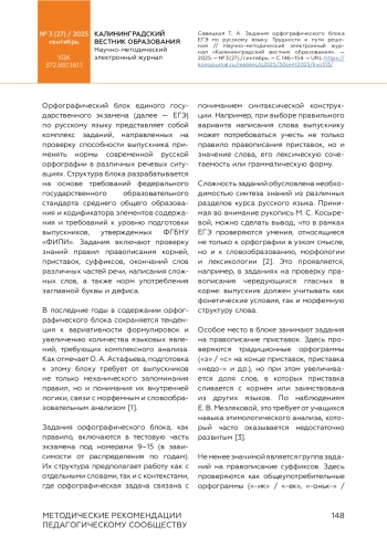 САВИЦКАЯ Т. А. ЗАДАНИЯ ОРФОГРАФИЧЕСКОГО БЛОКА ЕГЭ ПО РУССКОМУ ЯЗЫКУ. ТРУДНОСТИ И ПУТИ РЕШЕНИЯ // КАЛИНИНГРАДСКИЙ ВЕСТНИК ОБРАЗОВАНИЯ. 2025. № 3 (27)