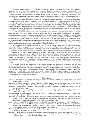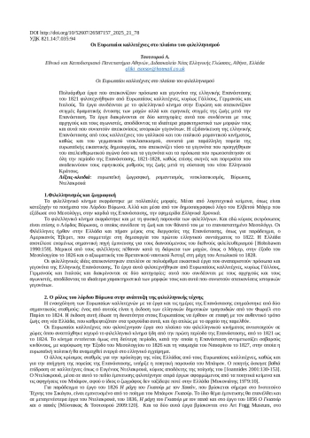 Многочисленные работы, изображающие людей и события греческой революции 1821 года, были созданы европейскими художниками, в основном французскими, немецкими и итальянскими. Работы связаны с эллинистическим движением в Европе и изображают моменты драматической интенсивности боевых действий, а также мирные моменты жизни после революции. Работы делятся на две категории: те, которые связаны с лидерами и бойцами, что придает им особые черты, и те, которые представляют собой изображения исторических событий. Идеализация греческой революции художниками французского и итальянского романтических течений, а также немецкого неоклассицизма представляет собой параллельное направление европейского художественного творчества, отражающее как события, предшествовавшие освободительной борьбе, так и события и личностей, стоявших у истоков революции 1821-1828 годов. в виде сцен и портретов, которые подчеркивают мирный ритм жизни после основания нового греческого государства.