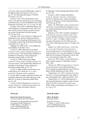 3. Евстропов М.Н. “Иное, чем бытие”: лицо в метафизике Эмманюэля Левинаса. Часть I: Черты лица // Вестник Томского государственного университета. 2011. № 342. С. 44-49.