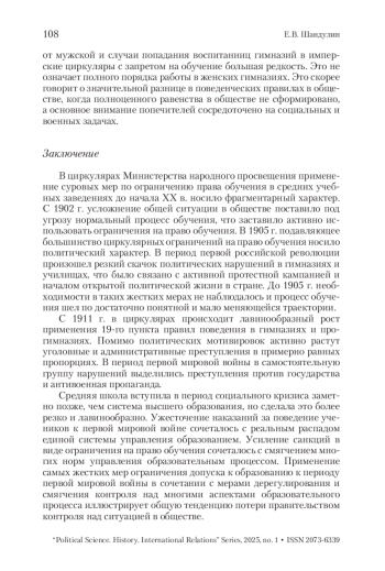 Статья посвящена изучению нарушений дисциплины и порядка в общеобразовательных средних учебных заведениях Российской империи на рубеже XIX–XX вв. В основе лежит изучение материалов циркулярных предписаний Министерства Народного просвещения с применением самых крайних мер лишения права на обучение в образовательных учреждениях страны. Проанализированы количественный и качественный состав нарушений, их динамика развития и взаимосвязь этого процесса с общеисторическими процессами в российском обществе в указанный период. Сделаны выводы о нарастании революционного кризиса в обществе на примере образовательной системы в определенных временных рамках, иллюстрирующих развитие социального кризиса в России в начале ХХ в. Рассмотрены пропорции политических, административных и уголовных преступлений в средних образовательных учреждениях страны. В статье сделаны наблюдения о религиозном, национальном и половом составе нарушителей в средних учебных заведениях на рубеже веков и указаны некоторые меры правительства по нормализации ситуации в обществе.