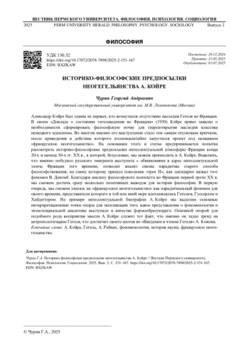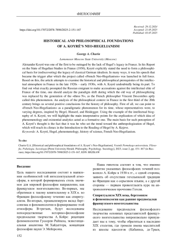 Александр Койре был одним из первых, кто возмутился отсутствию наследия Гегеля во Франции. В своем «Докладе о состоянии гегелеведения во Франции» (1930) Койре прямо заявлял о необходимости сформировать философскую почву для (пере)открытия наследия классика немецкого идеализма. Во многом именно его выступление стало тем самым спусковым крючком, после приведения в действие которого полномасштабно запустился проект под названием «французское неогегельянство». На основании этого в статье предпринимается попытка рассмотреть историко-философские предпосылки интеллектуальной атмосферы Франции конца 20-х и начала 30-х гг. XX в., к которой, безусловно, мы можем причислить и А. Койре. Выяснить, что именно побудило русского эмигранта выступить с обвинениями в адрес интеллектуальной элиты Франции того времени, позволит анализ смены парадигмы старого способа философствования, на смену которому пришло поколение «трех H», как лапидарно назвал этот феномен В. Декомб. Благодаря анализу философского контекста во Франции первой трети XX в. мы сможем достичь сразу несколько позитивных выводов для истории философии. В первую очередь, мы сможем указать на «французское неогегельянство» как парадигмальный феномен для своего времени, представители которого в той или иной мере вдохновлялись Гегелем, Гуссерлем и Хайдеггером. На примере интеллектуальной биографии А. Койре мы выделим основные интерпретационные точки опоры для экспликации того, какое представление о феноменологии и экзистенциальной аналитике выступало в качестве формообразующего. Основной опорой для подобного рода восприятия мысли А. Койре служит тот факт, что именно он задал тренд на антропологизацию Гегеля, что достигнет своего апогея во «Введении в чтение Гегеля» А. Кожева.