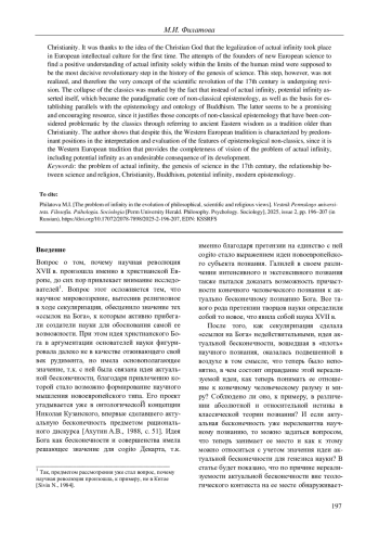 В статье показано, что проблемой бесконечности задается развитие соотношения науки и религии. В классический период эта проблема была представлена отношением науки и христианства. Именно благодаря идеи христианского Бога в европейской интеллектуальной культуре впервые произошла легализация актуальной бесконечности. Попытки основателей новоевропейской науки найти положительное понимание актуальной бесконечности в пределах только человеческого разума должны были стать тем самым решающим революционным шагом, который в истории генезиса науки так и остался несостоявшимся, в связи с чем сегодня предлагают пересмотреть саму концепцию научной революции XVII в. Крушение классики ознаменовалось тем, что вместо актуальной бесконечности заявила о себе бесконечность потенциальная, которая и стала парадигмальным ядром неклассической эпистемологии, а также основанием для установления параллелей с эпистемологией и онтологией буддизма. Последнее выглядит перспективным и обнадеживающим ресурсом, поскольку оправдывает проблематичные с точки зрения классики представления неклассической эпистемологии апелляцией к древневосточной мудрости как традиции более древней, чем христианство. В статье показано, что несмотря на это, для западноевропейской традиции характерны преимущественные позиции в интерпретации и оценке особенностей эпистемологической неклассики, т. к. именно западноевропейской традиции доступна полнота видения проблемы актуальной бесконечности, включающей потенциальную бесконечность в качестве нежелательного следствия своего развития.