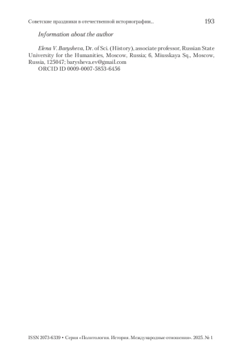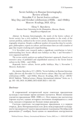 1. Барышева 2021 - Барышева Е.В. Советский государственный праздник в социальном конструировании нового общества, 1918-1941 гг.: Дис. ... д-ра ист. наук. М., 2021. 408 с.