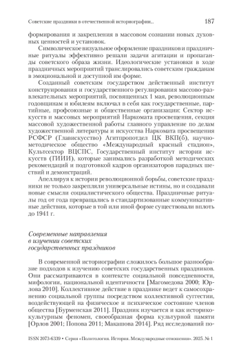 В отечественной историографии изучение праздничной культуры советского общества имеет богатую традицию. Разнообразные подходы к исследованию актуальной проблемы, обозначенные в данной статье-рецензии, демонстрируют сложившуюся на сегодняшний день историографическую ситуацию. Несмотря на достаточное число исследований социологов, философов, культурологов, и, конечно, историков, все еще остается целый ряд лакун, требующих изучения и осмысления.