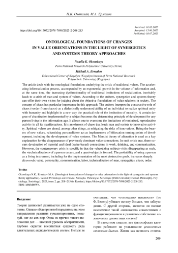 Исследуются онтологические основания кризиса традиционных ценностей. Ускорение процесса информатизации, сопровождаемое экспоненциальным ростом объема информации и одновременно нарастающей дисфункциональностью традиционных институтов социализации, неизбежно приводит к кризису человека и сложившейся системы ценностей. По мнению авторов, синергетика и общая теория систем могут предложить собственную оптику для суждения об объективных основаниях ценностных отношений в обществе. Особое значение здесь имеет понятие хаоса. Конструктивная роль хаоса («порядок из хаоса») интерпретируется как диалектически понимаемая способность личности к реализации духовного единства с человечеством, по-новому высвечивая практическую роль института морали. Определенная мера хаотизации, осуществляемая субъектом, становится определяющим принципом развития для любого человека информационной эпохи, позволяя преодолеть ограничения рутинизированной, репродуктивной деятельности во всех ее проявлениях. Именно элемент хаоса выводит человека и общество к тому, что называют инновационной деятельностью. Духовные ценности призваны, помимо прочего, купировать риски новаций. Будучи носителем новых ценностей, «личности-хаотизаторы» выступают как реализаторы бифуркационных поворотных точек прогресса, в т. ч. развития ценностных систем. В качестве ключевого объяснения исчезновения прежде доминирующих ценностных связей используется марксистская теория отчуждения от человека его сущностных сил. В такие кризисные эпохи происходит девальвация материальных и идеальных (базирующихся на ценностях) связей в труде, мышлении, общении. Однако спецификой современной кризисной эпохи является то, что «субъект-хаотизатор» рискует исчезнуть как таковой, происходит «технизация» человека, формируется квазисубъект. Резко увеличивается вероятность использования человека в качестве живого инструмента, в том числе для реализации самых деструктивных целей.