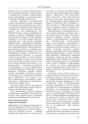 20. Чулошников А.И. Психологическое насилие сквозь призму деятельностного подхода // Вестник Пермского университета. Философия. Психология. Социология. 2023. Вып. 1. С. 84-97. DOI: 10.17072/2078-7898/2023-1-84-97 EDN: EHCTEB