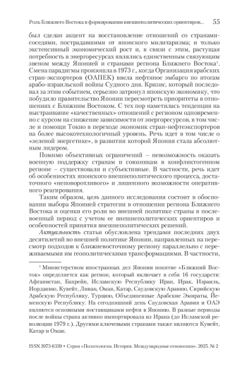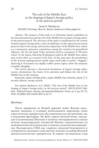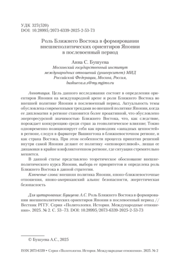 Цель данного исследования состоит в определении ориентиров Японии на международной арене и роли Ближнего Востока во внешней политике Японии в послевоенный период. Актуальность темы обусловлена современными трендами во внешней политике Японии, когда ее дипломатия в регионе становится более проактивной, что обусловлено энергоресурсной значимостью Ближнего Востока, что, как следствие, порождает конкуренцию среди стран за геополитическое влияние; Токио одновременно позиционирует себя как проводник «западных ценностей» в регионе, следуя в фарватере Вашингтона в ближневосточном регионе, и как страна Востока. При этом особенности процесса принятия решений внутри самой Японии делают ее политику «неповоротливой», лишая ее динамики в крайне конфликтогенном регионе, где ситуация стремительно меняется.