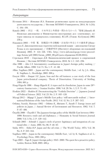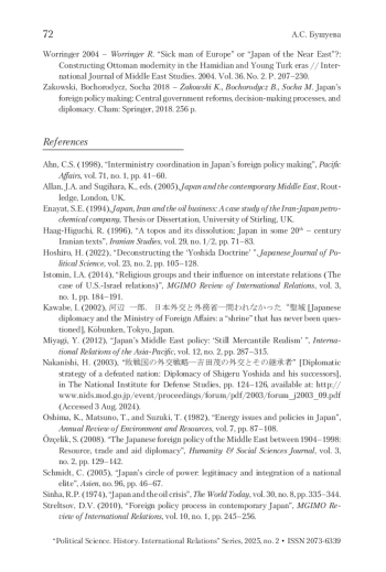 12. Özçelik 2008 - Özçelik S. The Japanese foreign policy of the Middle East between 1904- 1998: Resource, trade and aid diplomacy // Humanity & Social Sciences Journal. 2008. Vol. 3. No. 2. P. 129-142.