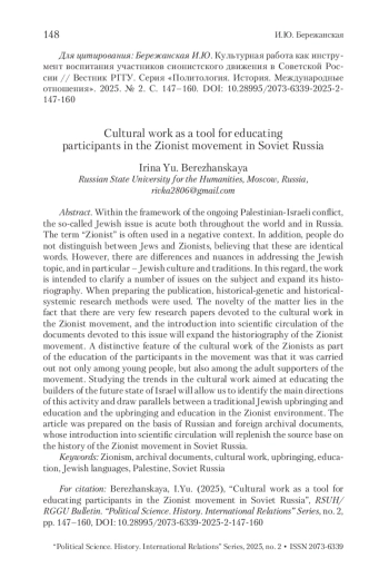 В рамках не затихающего палестино-израильского конфликта остро стоит так называемый еврейский вопрос как во всем мире, так и в нашей стране. Часто звучит термин «сионист» в негативном контексте. Кроме того, многие не разделяют евреев и сионистов, полагая, что это идентичные слова. Тем не менее существуют различия и нюансы при подходе к теме еврейского вопроса, а в частности культуры, традиций. В этой связи работа призвана уточнить ряд вопросов по теме и расширить ее историографию. При подготовке публикации были применены историко-генетический и историко-системный методы исследования. Новизна вопроса заключается в том, что трудов, посвященных культурной работе в сионистском движении, крайне мало, а введение в научный оборот документов, посвященных данному вопросу, расширит историографию сионистского движения. Отличительной чертой культурной работы сионистов в рамках воспитания участников движения было то, что она велась не только среди молодежи, но и среди взрослых сторонников течения. Изучение тенденций культурной работы с целью воспитания строителей будущего государства Израиль позволит вычленить основные направления этой деятельности, провести параллели между традиционным еврейским воспитанием и образованием и воспитанием и образованием в сионистской среде. Статья подготовлена на основе российских и зарубежных архивных документов, чье введение в научный оборот пополнит источниковую базу по истории сионистского движения в Советской России.