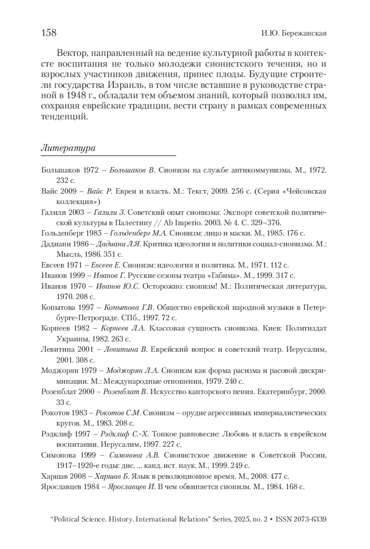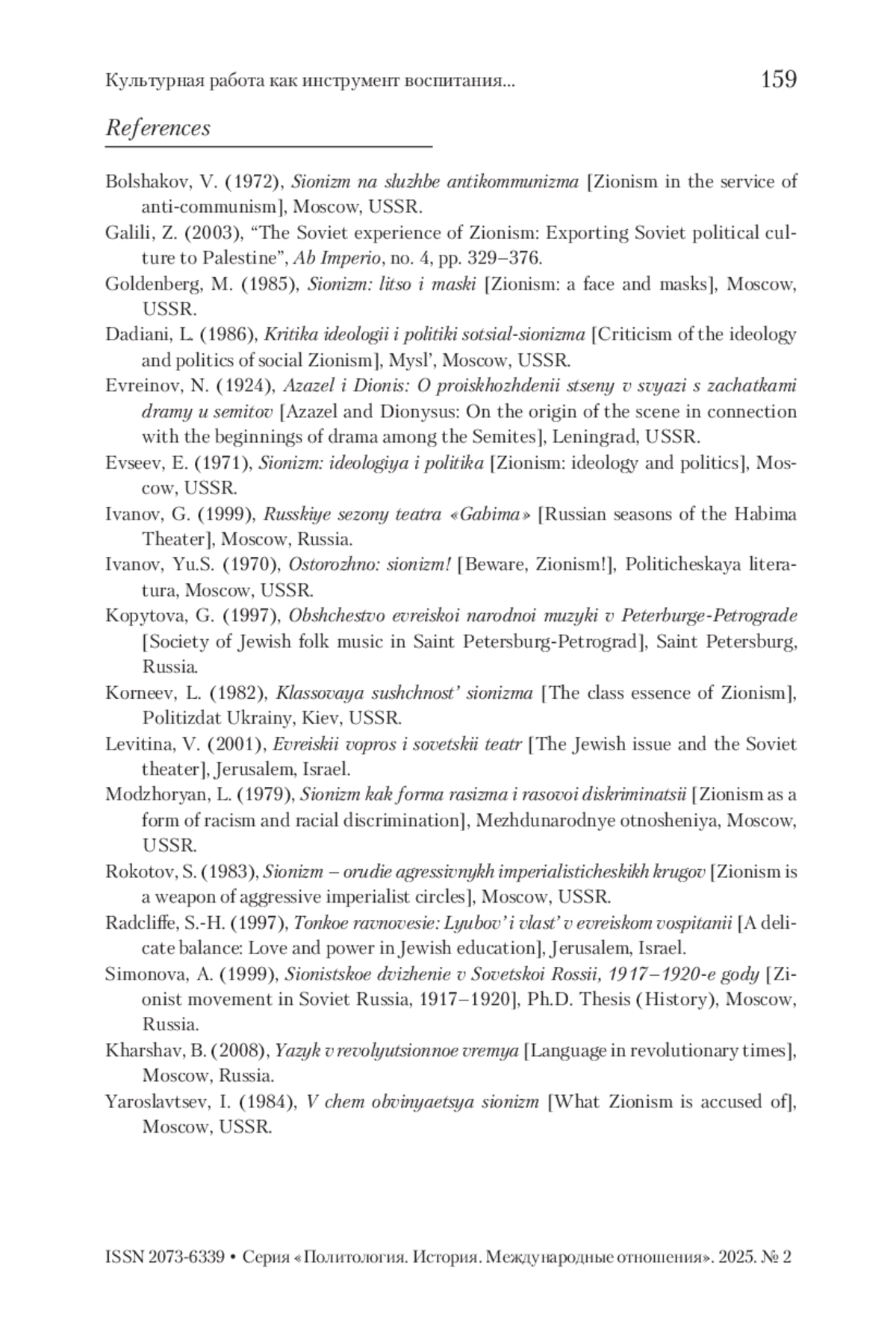 6. Евсеев 1971 - Евсеев Е. Сионизм: идеология и политика. М., 1971. 112 с. Иванов 1999 - Иванов Г. Русские сезоны театра «Габима». М., 1999. 317 с.