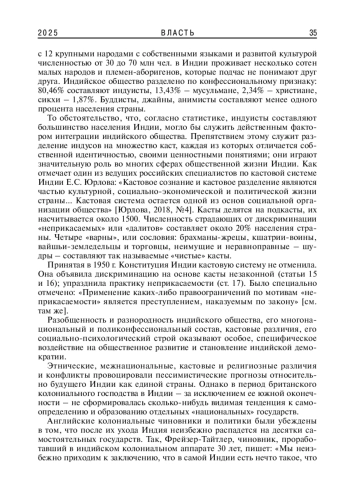 Индия сегодня - это динамично развивающаяся страна с эффективной экономикой и стабильной политической системой, основанной на принципах представительной демократии и федерализма. Индийское общество представлено индуистами, мусульманами, христианами, сикхами и др. Индуисты разделены на множество каст и четыре варны. Конституция объявила дискриминацию на основе касты незаконной. Разобщенность индийского общества воздействует на общественное развитие. В основу единого федерального государственного устройства положен национально-территориальный принцип. Британские колониальные чиновники были убеждены в том, что после их ухода Индия распадется на десятки самостоятельных государств. Однако Конституция заложила основы единства страны, формирования республиканского строя и утверждения парламентской демократии. Она предусматривает сильный центр и автономные штаты, полномочия которых четко разграничены. В состав Индии вошли княжества; Джамму и Кашмир получил особый статус в соответствии со статьей 370 Конституции Индии. В 2019 г. эта статья была отменена и образованы две союзных территории - Джамму и Кашмир и Ладакх с целью большей интеграции их в состав Индии. В 1962 г. был создан Совет национальной интеграции для обсуждения проблем общинности, кастовой системы, терроризма, поликонфессиональности и языковой разобщенности. После прихода к власти БДП Совет фактически перестал существовать. Главным для индийского государства остается сохранение территориальной целостности и единства страны.