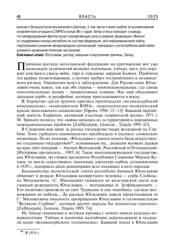 В науке и информационном пространстве идёт дискуссия о причинах распада Югославии (СФРЮ). Большинство учёных и политиков разных стран придерживаются версии о большой роли внутренннего фактора, в том числе о вине сербов за возникновение конфликтной ситуации в СФРЮ в конце 80-х годов. Автор статьи приходит к выводу, что международный фактор играл определяющую роль в развале федерации. Именно он поддерживал выход республик из состава федерации, вёл информационную войну, подтасовывал решения международных организаций, принуждал к антисербским действиям, разжигал националистические настроения.