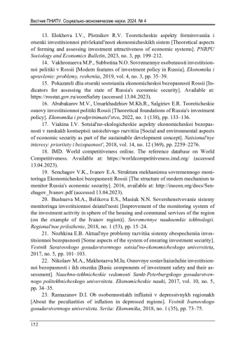 21. Ножкина, Е.Б. Актуальные проблемы развития системы обеспечения инвестиционной безопасности / Е.Б. Ножкина // Вестник Саратовского государственного социально-экономического университета. - 2017. - № 5. - С. 101-103. EDN: YLSBZA