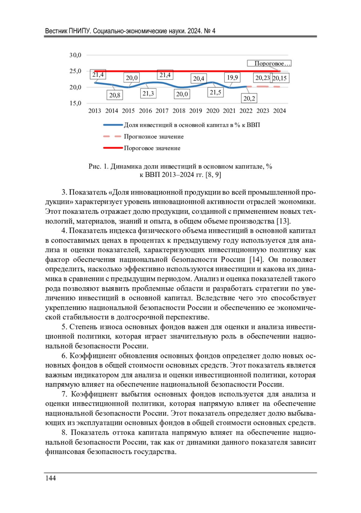 Рассматривается роль инвестиционной политики в обеспечении экономической безопасности. С целью построения интегрального показателя и оценки уровня экономической безопасности в инвестиционной сфере авторы анализируют целый ряд показателей, такие как доля инвестиций в ВВП, расходы на научные исследования, доля инновационной продукции, индекс физического объема инвестиций в основной капитал, степень износа основных фондов, коэффициент обновления основных фондов, коэффициент выбытия основных фондов. На базе этого был построен интегральный показатель и сделан вывод о его динамике 2013-2024 гг. (включая прогнозный период). К числу первоочередных мер, способных повысить уровень экономической безопасности в инвестиционной сфере, авторы отнесли меры подавления инфляции и, как следствие, удешевление кредитов для бизнеса, а также изменение структуры инвестиций в базисе их возникновения. Авторы также предлагают осуществлять сертификацию инвестиционных проектов и осуществлять выдачу государственных гарантий будущим инвесторам. Механизм сертификации предусматривает увеличение доли государственной поддержки проекта, при выполнении условия, что такой инвестиционный проект не имеет в своем роде аналогов на рынке товаров и услуг. Механизм участия и вмешательства государства в процессы поддержания и развития сферы инвестиционной деятельности широк и условно может быть разделен на несколько методов регулирования. Такими методами регулирования являются административные (прямые) и экономические (косвенные) методы воздействия на инвестиционную сферу экономики государства. Данные методы регулирования тесно связаны и в целом являются неразрывными в векторе достижения целей инвестиционной безопасности.