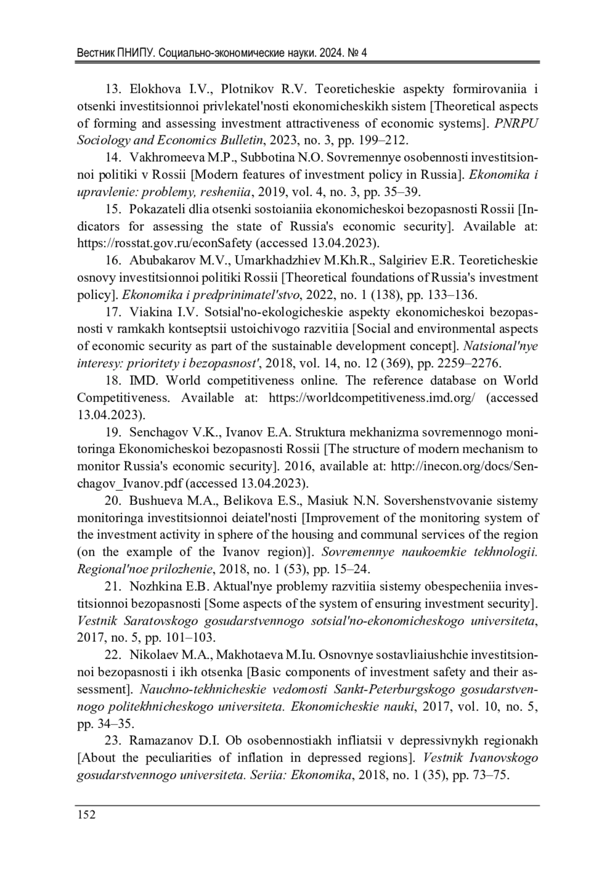 13. Елохова, И.В. Теоретические аспекты формирования и оценки инвестиционной привлекательности экономических систем / И.В. Елохова, Р.В. Плотников // Вестник Пермского национального исследовательского политехнического университета. Социально-экономические науки. - 2023. - № 3. - С. 199-212. EDN: WKXLSJ