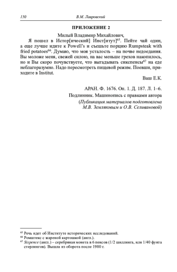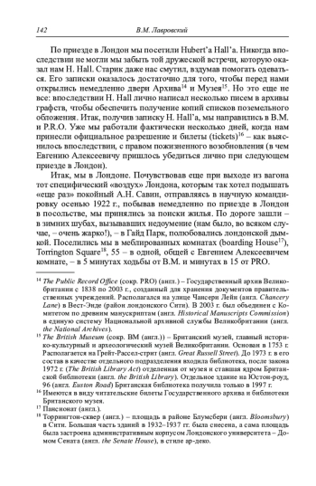 Авторы публикации знакомят читателя с воспоминаниями и впечатлениями В. М. Лавровского о посещении им Великобритании в ходе научной командировки 1925 г. (совместно с Е. А. Косминским). Этот документ из личного фонда исследователя в Архиве РАН (АРАН) никогда ранее не публиковался. Во вступительной статье рассматривается краткая научная биография каждого из ученых на фоне зарождения и развития советской исторической науки в 1920-х - 1960-х годах. Особое внимание авторами уделяется вопросам, касающимся способов решения различных исследовательских задач в ходе этих командировок, общения советских и английских историков на международных конференциях, семинарах, коллоквиумах, а также политики советского правительства и научных организаций в области заграничных командировок в 1925-1960 гг. Эти воспоминания особенно ценны сведениями, которые обычно нельзя отыскать в официальных научных отчетах: личными впечатлениями ученого от посещения английских городов (в первую очередь - Лондона) и графств, библиотек, архивов, научных учреждений и университетов; от неформального общения с коллегами - профессорами, молодыми исследователями и студентами, - и обсуждения развития научных, культурных и дипломатических отношений СССР и Великобритании.