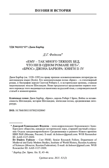 Поэма «Брюс» и ее автор Джон Барбор, архидиакон Эбердинского епископства в Шотландии, уже были представлены читателям журнала «Средние века» 2. Уточним время создания этого замечательного исторического и литературного памятника. В самом тексте прямо указана дата – 1375 г., но появляется она только в конце XIII (ст. 699–704) из 20 книг, и трудно поверить, что столь огромный труд (по полному счету 13 722 стиха) мог уложиться в один год. Видный историк и редактор новейшего издания «Брюса» Арчибалд Данкан полагал, что Барбор приступил к сочинению в 1372 г., после восшествия на престол короля Скоттов Роберта II (1316–1390; правил с 1371)3. На мой взгляд, почин мог быть сделан и раньше – до 1371 г., когда Роберт Стюарт пребывал законным наследником бездетного Дэвида II.