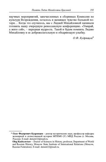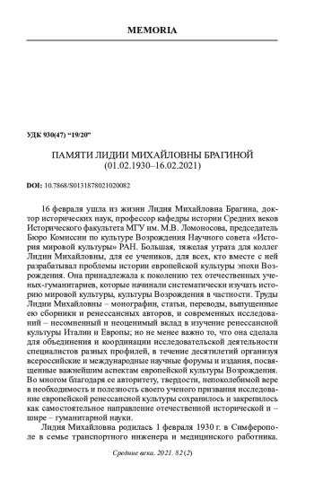 16 февраля ушла из жизни Лидия Михайловна Брагина, доктор исторических наук, профессор кафедры истории Средних веков Исторического факультета МГУ им. М. В. Ломоносова, председатель Бюро Комиссии по культуре Возрождения Научного совета «История мировой культуры» РАН.