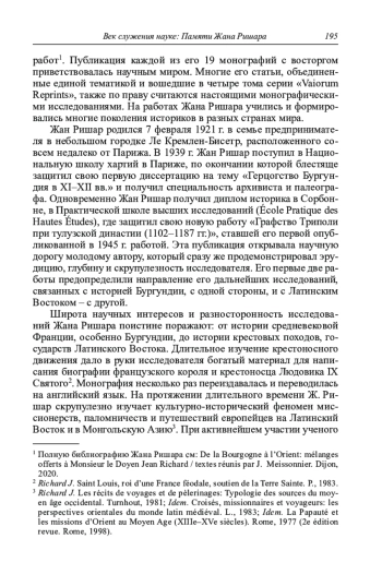 25 января 2021 г. ушел из жизни Жан Ришар – известнейший французский ученый-медиевист XX – начала XXI в., профессор университета в Дижоне, представитель Школы хартий, член многих академических исторических и археологических обществ. С 1987 г. Жан Ришар – член Академии надписей и изящной словесности (Académie des Inscriptions et Belles-Lettres) и с 2002 г. ее президент; с 1968 по 2015 г. – президент старейшего во Франции Общества словесности, наук и искусств (Société éduenne des lettres, sciences et arts), занимающегося почти уже два столетия изучением истории Бургундии; первый президент Общества изучения истории крестовых походов и Латинского Востока (Society for the Study of the Crusades and the Latin East), основанного в 1980 г.; в 1968–1971 гг. декан Факультета словесности университета в Дижоне; президент «Региональной ассоциации сохранения наследия Бургундии»; член Академии Морвана; член «Европейского общества по изучению истории Бургундии»; член историко-археологического «Общества антикваров Франции»; член «Общества искусств в Женеве» и почетный член «Общества кипрских исследований».
